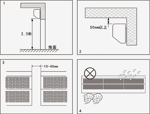 1請(qǐng)將風(fēng)幕機(jī)安裝在室內(nèi)門(mén)的上方,風(fēng)幕機(jī)出風(fēng)口離地面的距離應(yīng)高于2 . 3米。